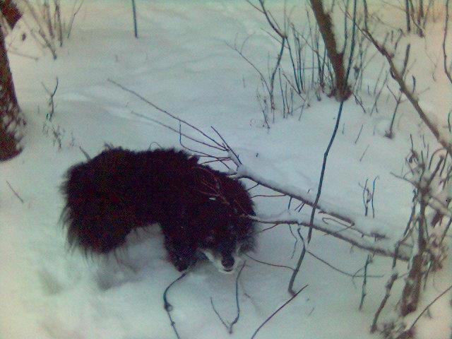 И тут пёсик наш сперва меня даже испугал ибо просто-напросто неожиданно повалился на бок. Но как оказалось, он не просто повалился, он принялся интенсивно кувыркаться и купаться в снегу, изо всех сил размахивая лапками во все стороны. Он выскакивал из-под снега, снова нырял туда, размахивал лапами и хвостом, выныривал и снова нырял. Периодически я наваливал на питомца небольшие сугробики, и тот радостно и уверенно преодолевал их, вновь разбрасывая снег вокруг себя.
