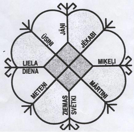Лиго, или Янов день (по-латышски Jāņi) приходится как раз на самую короткую ночь в году – Янову ночь. На картинке отлично видно, что Лиго стоит как раз напротив Зимних праздников.