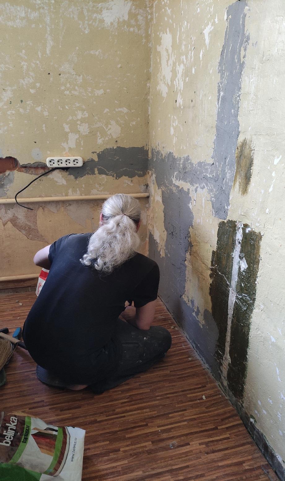 Всем добра! На фото Макс выравнивает кривую ободранную стену, пожелайте ему удачи =)