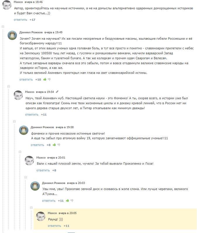 Воодушевленные славянофилы (долбославы) атакуют по всем фронтам. И казалось бы, хотя бы тут, среди авторов книг и читающих людей как-то не ожидаешь увидеть поклонников звенящих кедров и миллионов лет украденной рептилоидами славянской истории. Но, как мне вчера задали вопрос в одной из веток обсуждения: