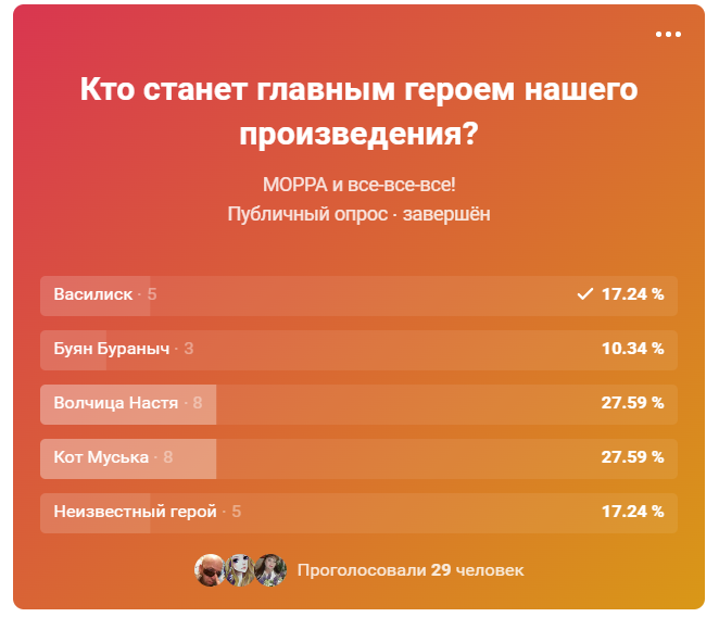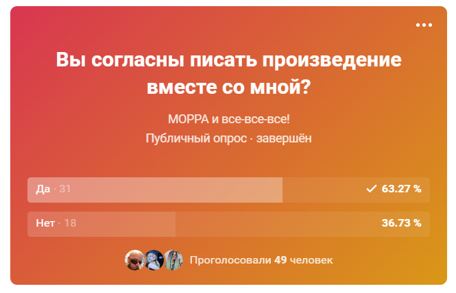 Поясняю - МОРРА будет выкладывать очередной эпизод и вопрошать у читателей, в каком направлении двигать ему далее свой сючитатель, соответствующим образом выбрав варианты из прилагающегося опроса, определяет эти самые направления.