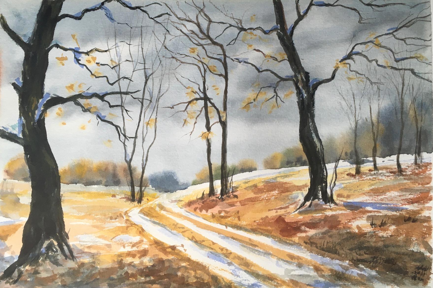 И наконец последнее по календарю - все ближе к зиме и даже с первым снегом! Это была медитация во время рисования веток... И получилось холодней и суровей, чем у ведущего - но я именно так и хотела. Чтоб тучи нависали, а мокрый снег в тени казался тяжелым и стволы - сырыми. Немного не дотянула фактуру стволов, правда (