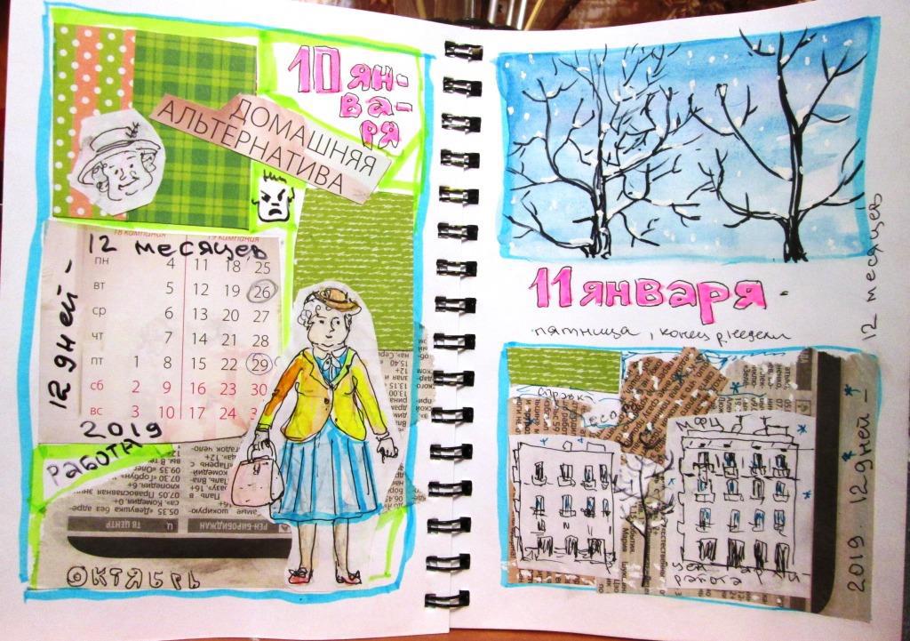 10 января я как-то устала и рисовать была не в силах. И ярких визуальных впечатлений тоже не было. Поэтому этот день я решила изобразить при помощи простого коллажа. Нарисованная старушка вырезана из моего блокнотика с набросками.