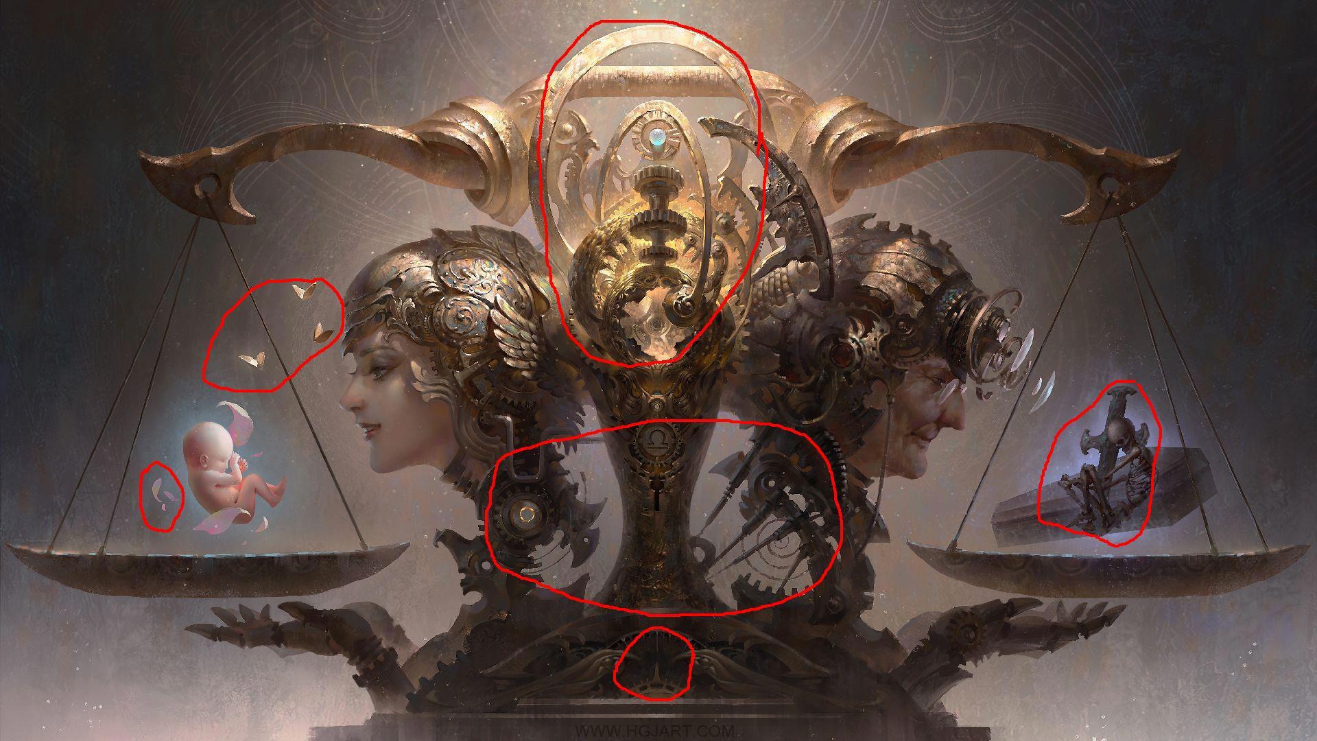 Первое - пришлось определять знаковую систему. Восток и Запад  довольно отличаются друг от друга, и даже если автор переходит на другую знаковую систему, кое-что  все равно останется привычным. Ну как направление  написания - чтения.  По общему колориту я решила что художник - китаец. Ну вот тут не спрашивайте точно - как.   На ощущение этого работает фон, верхняя часть весов и шлемы  Двуликой - как я ее назвала,бабочки и лепестки лотоса около младенца.  Ну а раз Китай, то вспоминаем, что в Китае написание и чтение закладываются сверху вниз справа налево.