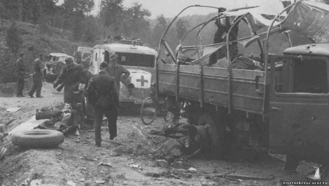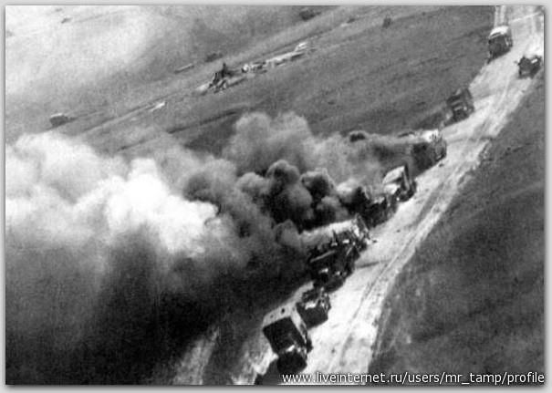 Разбитая при воздушном налете колонна. Наличие спецмашин медицинских - то ли оказывают помощь и потому прибыли - или сами попали под удар.