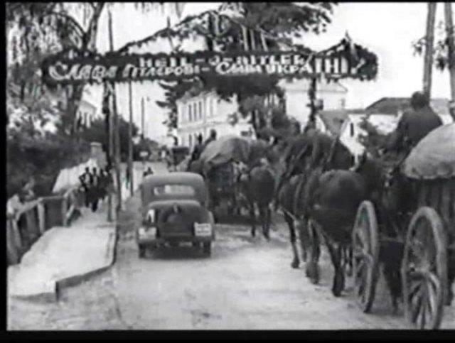 Обозная колонна въезжает в населенный пункт, украшенный приветственным лозунгом.