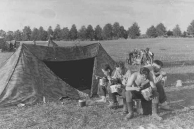Жрут горячее из котелков днем - видно что тыл. Шатер из плащ-палаток, никаких окопов и щелей.