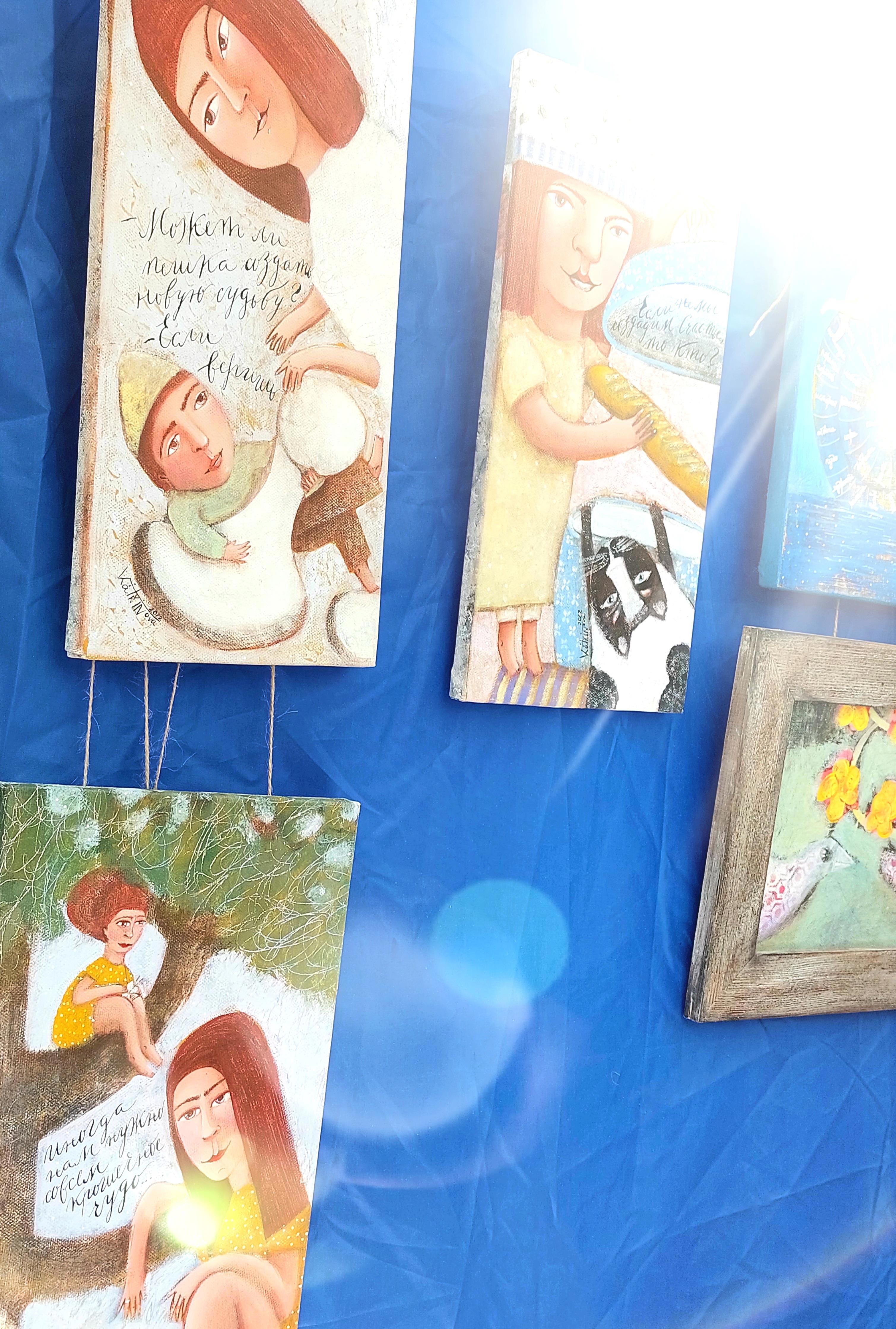 В её работах, наполненных юмором и любовью к людям, гармонично сочетаются: персонажи, словно выскочившие из доброго мультика, их уютные пейзажи и интерьеры, и шрифтовые композиции из букв, слов и даже фраз.