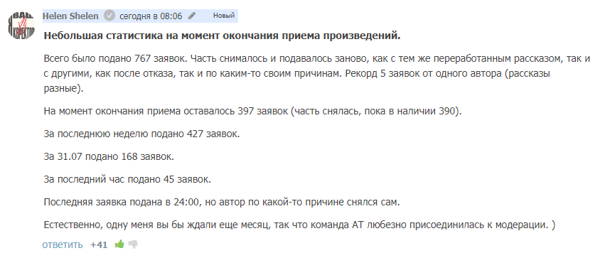 Админы тут поделились статистикой о конкурсе. Очень приятно, что первое моё опубликованное произведение(которое я написал буквально за один присест за пару часиков) прошло премодерацию с первого раза и попало в число участников.