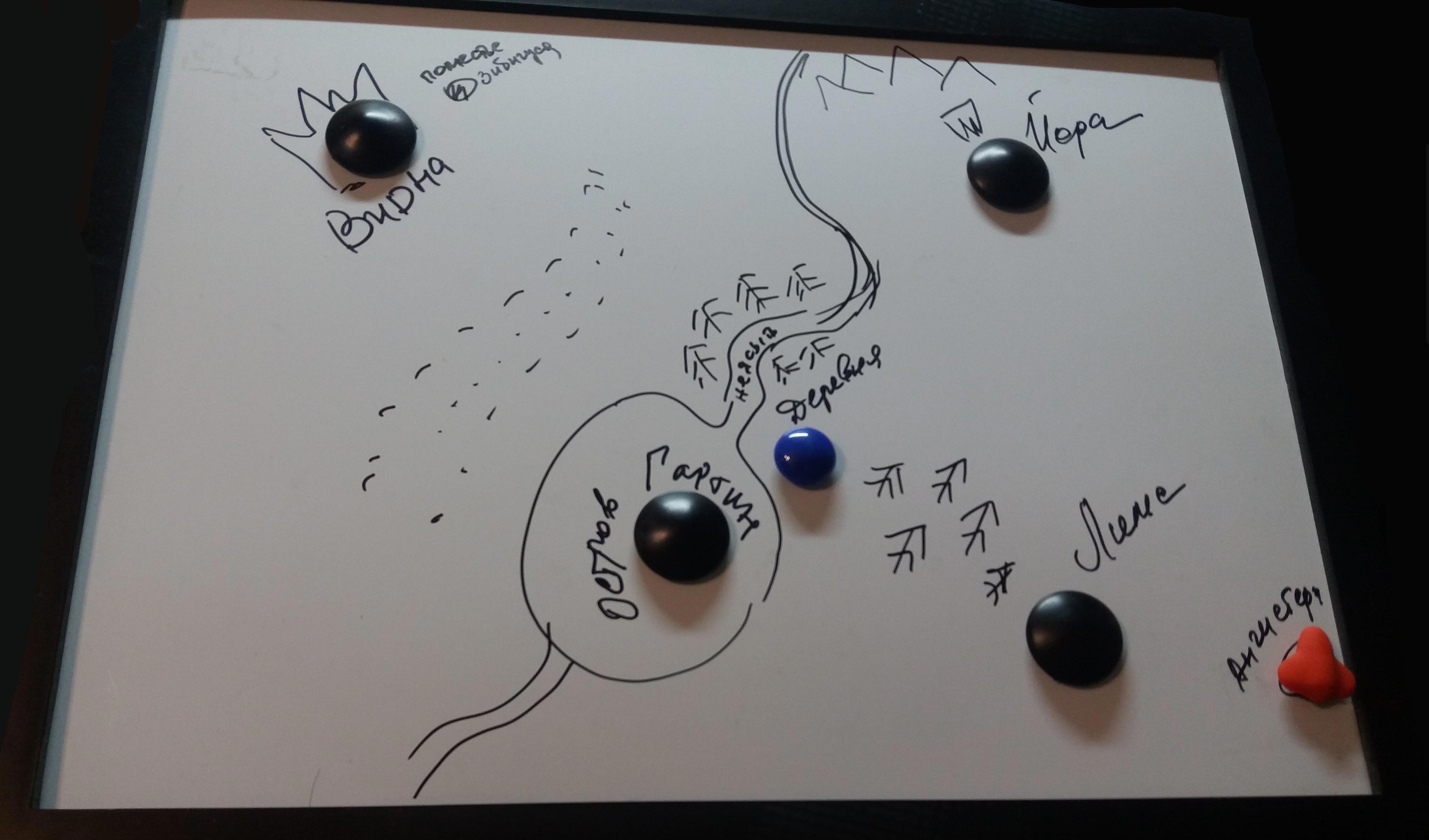 Зачем рисую вот так и магнитики леплю? Для мозга это хорошая возможность «увидеть» мир целиком, очень помогает в работе. Именно «рисованные» планы а не просто перечисление на бумаге, кто из героев что делает.
