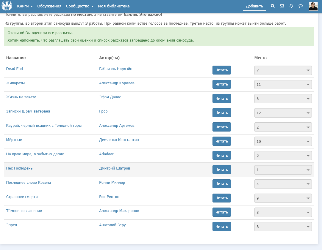 Ну, как-то так! Всё вышенаписанное - моё восприятие, чего и требовал этап. Сам я не прошёл, что слегка обидно, но неудивительно - мало старался. Хотя, судя по количеству библиотек и время чтения, не все из судий прочитали мой рассказ. И это уже обидно.