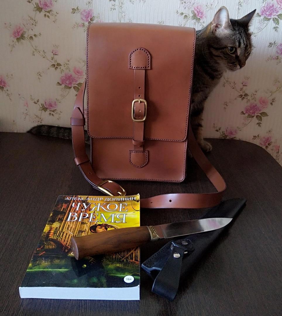 Сумка 20х30х10 см, из кожи толщиной около 2,5мм. Внутри - нейлоновый подклад с клеевым слоем. Все торцы стенок усилены накладками. Пряжки- литая латунь. Прошивка - синтетическая плетеная вощеная нить 1мм.