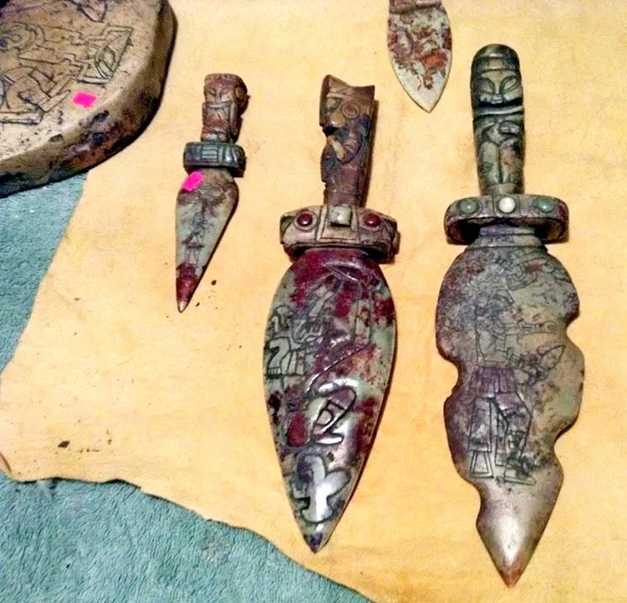 Кстати, Гарсия Санчес щи лаптем не хлебает и поставил всё дело на вполне даже системную основу, для чего в городе Охуэлос организовал общественную организацию из активистов и местных под названием Оллин МНИАИ (как переводится – не знаю). Члены организации собрали такую коллекцию странных штук, что сами уже теряются в цифрах. Одни говорят, что их больше, чем 350, а другие говорят, что их чуть меньше, чем 400! В общем, если кто-то поедет туда и ему там кто-то втихаря продаст, несомненно подлинный артефакт из-под полы, то не сомневайтесь – это никакая не подделка. Всё по-настоящему. Он ничем не хуже тех, что находятся в коллекции. А ещё они создали постоянную телепрограмму под названием «Потерянный рай Ацтлана» (Aztlan El Parasio Perdido) на местном канале. Для тех, кто подзабыл подробности, напоминаю, что Ацтлан (Aztlan) – это легендарная прародина легендарных ацтеков. Между тем энергичному «вождю краснокожих» всего этого показалось мало, и он привлёк для изучения находок Мексиканский Научный Институт Антропологии и Истории (МNAH). Историки сверили представленные артефакты со своими каталогами и сделали возмущённое заключение, что они с ихними каталогами не имеют ничего общего, а потому являются грубыми подделками. Вообще у историков получилось смешно, потому что они ссылаются на искусство майя и говорят, что изображения им не соответствуют. А причём здесь именно майя, не говорят. Ну, и насчёт «грубых» я бы тоже поспорил, между прочим. Хоть и странноватые по содержанию, но вполне даже симпатичные сувенирчики: