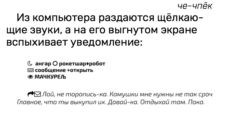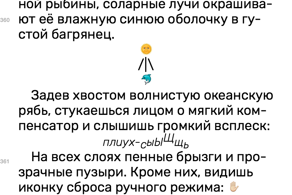 Нам ничто не мешает, верстать книгу, и дополнительно выделять внутреннюю переписку героев, чтобы глубже погрузить читателю в историю.