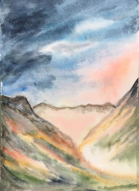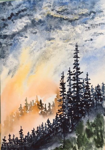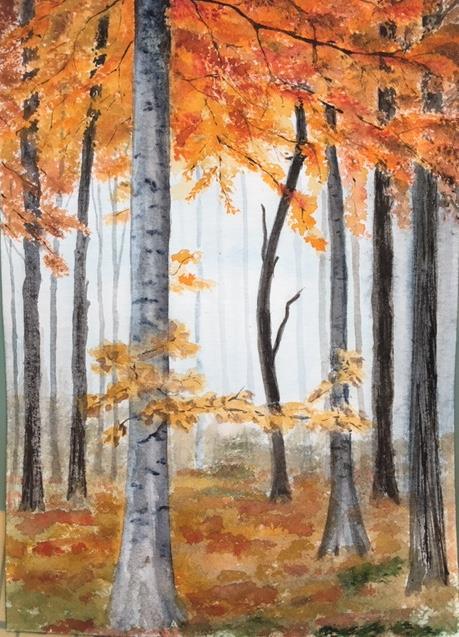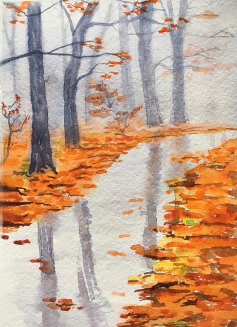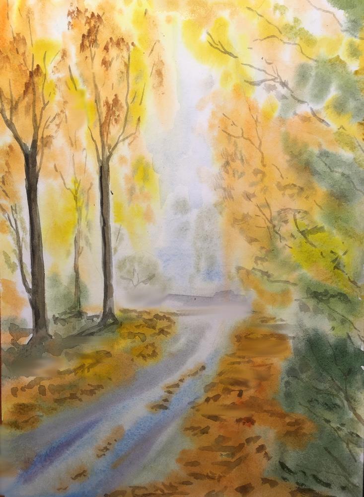 Продолжу вертикальненькими... По мастер-классу тут только четвертая (жестковато вышло, но светится), остальное с фотореференсов, желтеющие листья березки с улицы на моем перекрестке, закат, окрасивший туман в лесу в цвет пожара - своя фантазия.