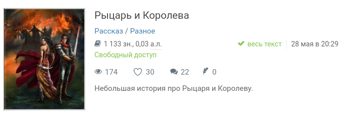 Хочу поделиться с вами новостью. Мой небольшой рассказ "Рыцарь и Королева" https://author.today/work/196546 набрал 30 лайков при 174 просмотрах. Я очень счастлива, что моё творчество нравится и это продвигает на дальнейшее написание новых книг.