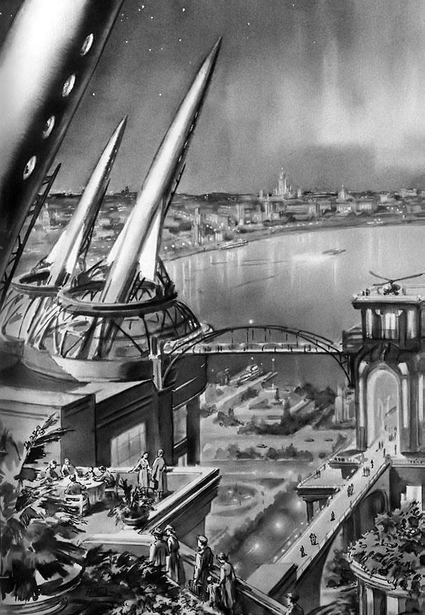 Глядя на ретро-футуристическую картину Николая Кольчицкого (1952), я думаю - А долго ли проживут люди в открытом ресторане после старта ракет?.. ну, и те, что на виадуке выстроились. И вообще всё там вокруг.