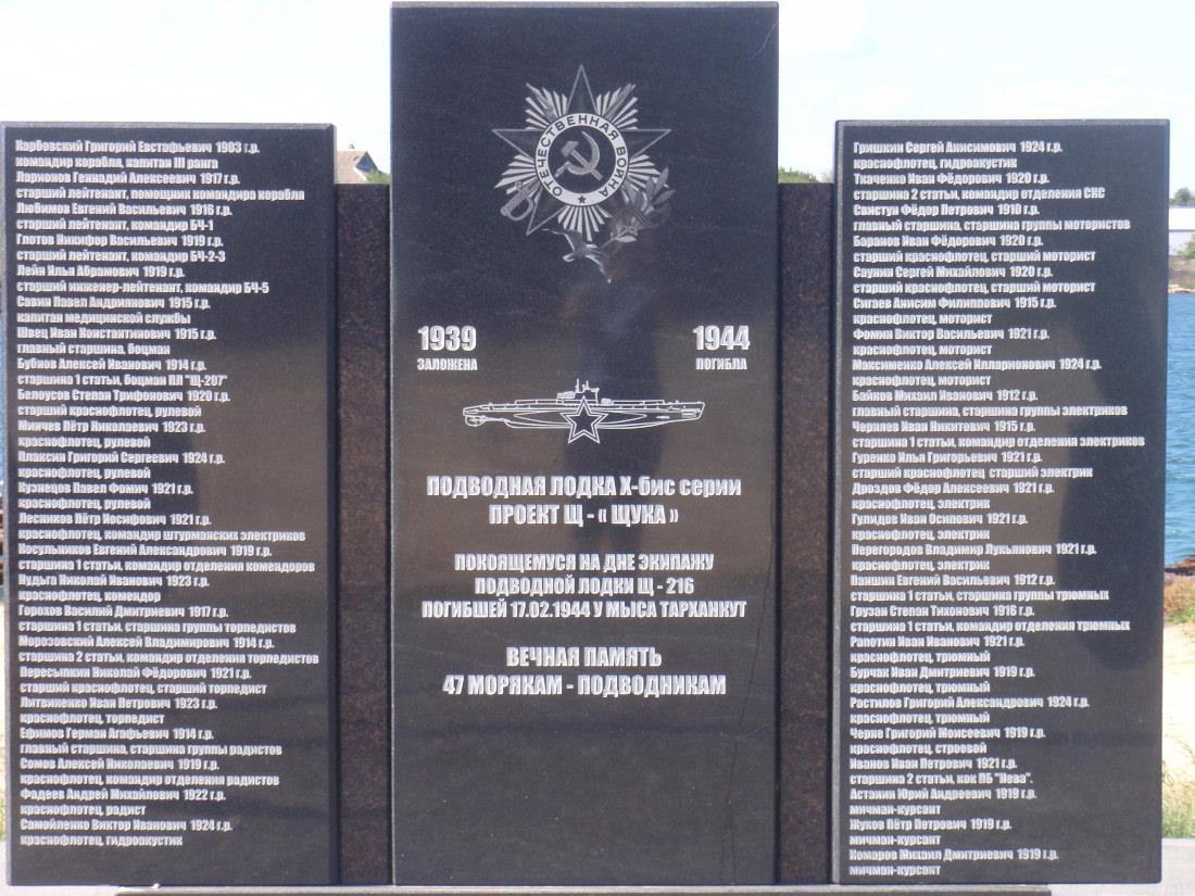 Сильное впечатление произвел памятник морякам подлодки "Щ-216". Лодка погибла в феврале 1944-го, в четырнадцатый боевой выход – как раз в районе Тарханкута. Обнаружена она в 2013 году. Одно время рассматривалось её поднятие усилиями российского и украинского флотов. Однако из-за возможной детонации боезапаса от этой идеи отказались, подняли только часть рубки и фрагменты обшивки. Эти кусочки металла вскоре были переданы родственникам погибших моряков, которые приехали в Крым из Израиля, Донецка и Московской области.