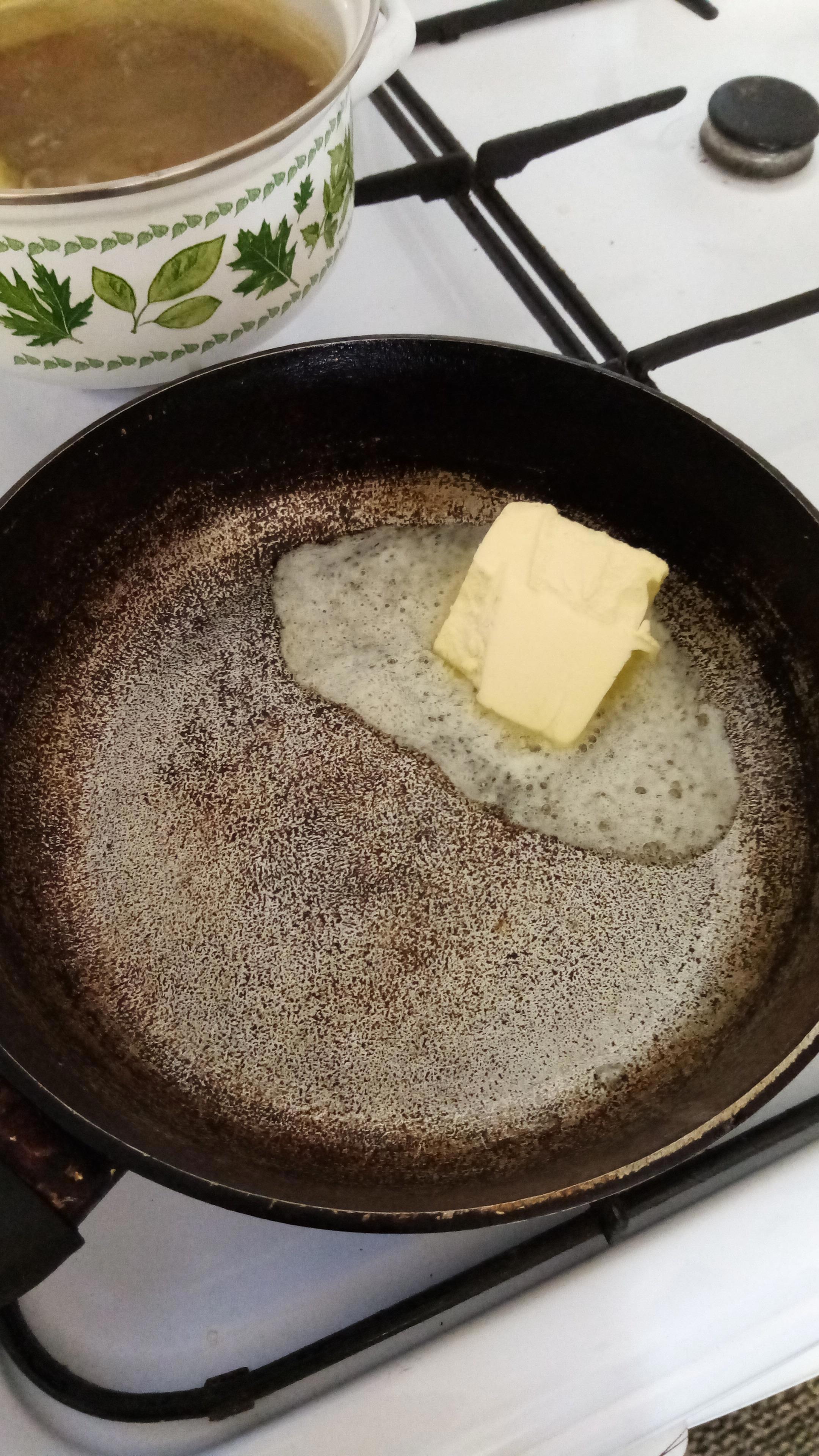 Берём сливочное масло и сковородку, масла не жалеть не надо, бабушка всегда брала две полные столовые ложки топленого сливочного масла, топленого у меня нет, взяла обычное.
