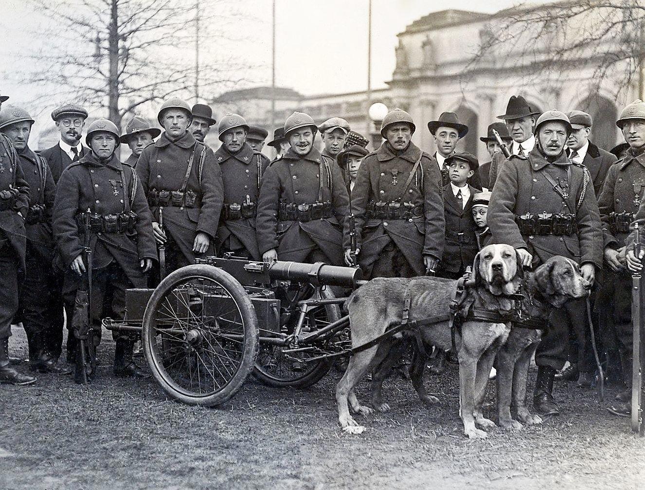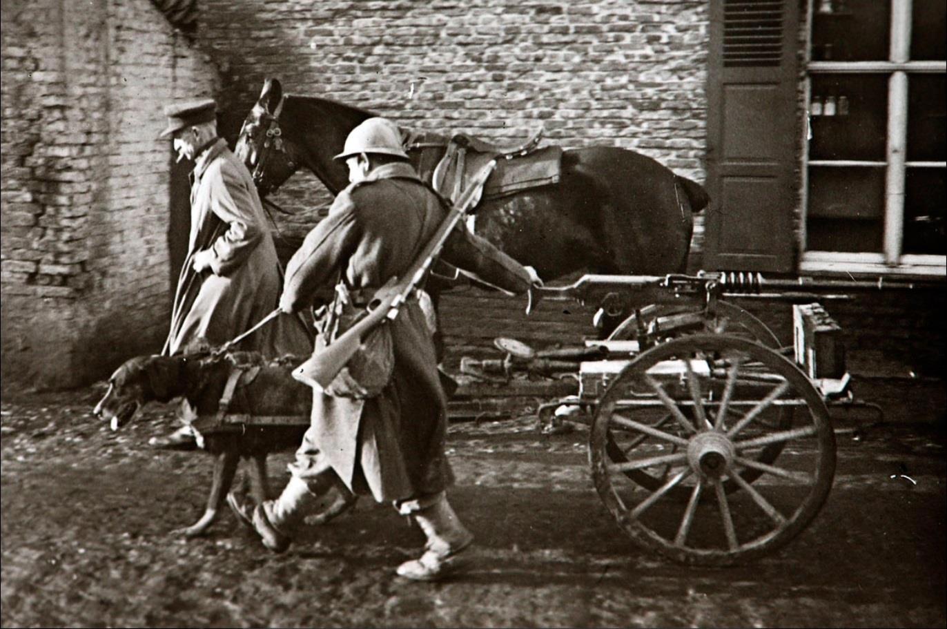 Ну а во время войны транспорт подлежал мобилизации и эти песели таскали на тележках пулеметы. Начали бельгийцы. Здесь бельгийский карабин Маузер и кавалерийский Гочкис с прикладом.
