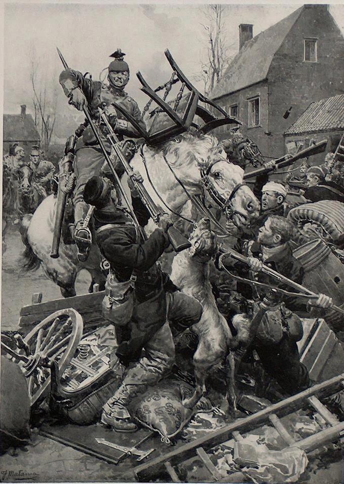От себя скажу, что собаки вполне бодро тянут и тележки и санки, даже не специально ездовые. А вот атаковать лошадь не всякая собака решится. Так что художник нарисовал весьма героического пса.