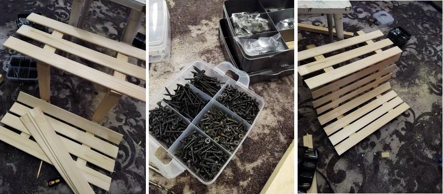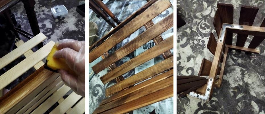 Разумеется, после распила планки  тщательно зачищаем шкуркой. Затем  готовую конструкцию  обрабатываем  водной морилкой. Обратите внимание на необходимость жесткой фиксации углов, котики у меня  пятикилограмовые, но бережёного Бог бережёт.