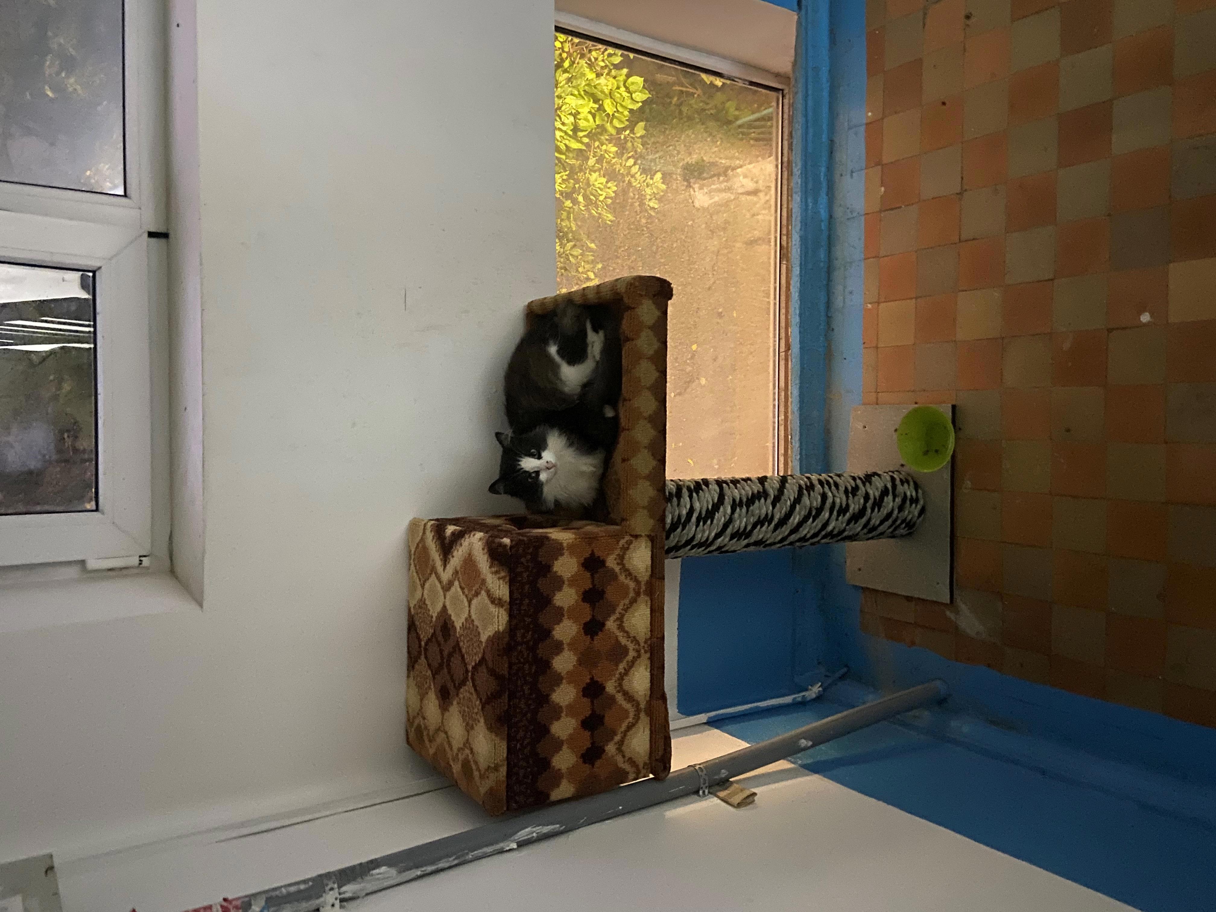 И вот  Анатолий для кота  смастерил домик. Стоит эта прелесть на лестнице между вторым и третим этажом. И Маркиз запечатлен                       на нем же.