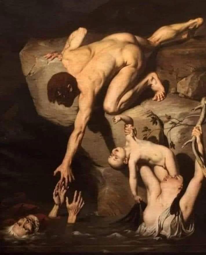 Вот одна из трактовок картины: мужчина пытается спасти отца и полностью игнорирует жену и сына. Жена и мать олицетворяет жизнь, сын - будущее, а старик олицетворяет прошлое, за которое человек цепляется и теряет свою жизнь и будущее... Хотя, женщина держится за сук, возможно, мужчина просто здраво оценил обстановку и бросился на помощь тому, кто уже тонет. Но я бы все равно первым спасала ребенка.