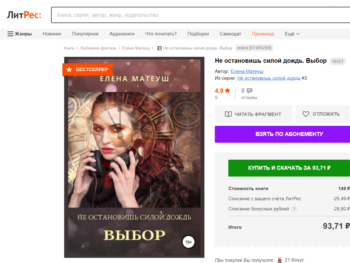 Литрес многие ругают, но для меня он стал первой площадкой, открывшей дорогу к читателям, и за это ему я до сих пор благодарна. Ещё мне нравится, что они стараются учить своих авторов, сами занимаются маркетингом - играют с ценами, придумывают какие-то акции, дают рекламу. Я так видела свои книжки в таргете. Вчера мне выскочило напоминание в ЖЖ о моём посте 3 года назад, где я радовалась первым своим проданным книжкам. Их было меньше 5 продаж, и сумма, по-моему, даже 100 руб. не достигала. А на днях я первый раз получила там ленточку "Бестселлер" на свою новую книгу.