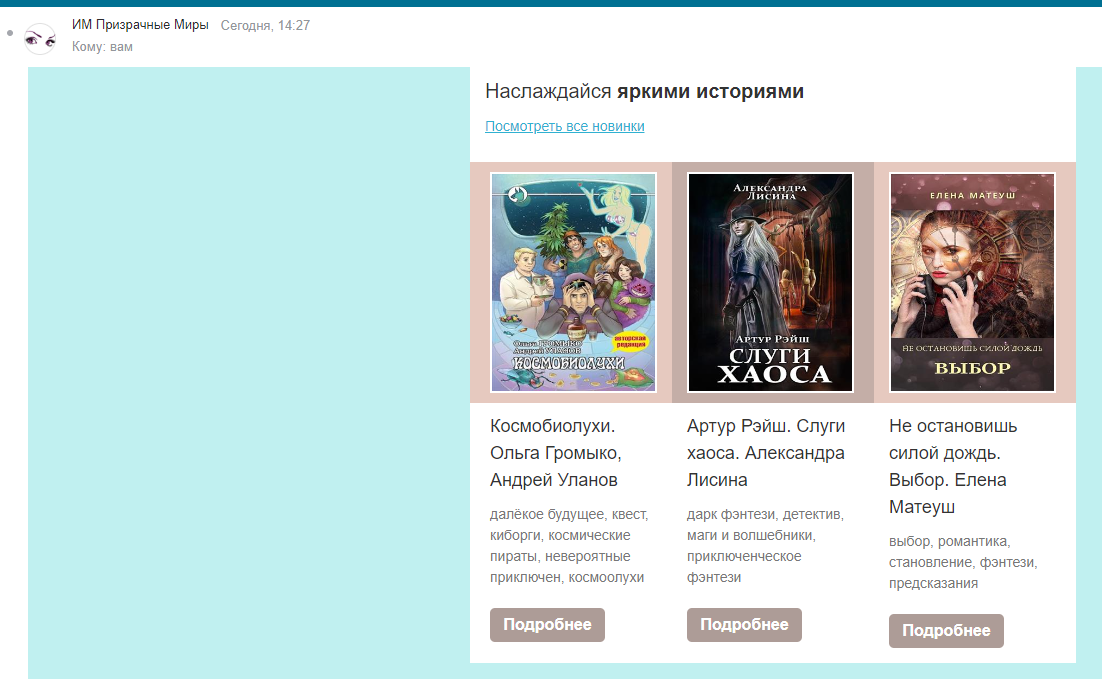 Прорекламировать свой "Выбор" я решила на другой своей площадке - Призрачных Мирах, где роялти автору куда приятней, чем на Литрес. Пока рекламу ещё не запустили, но сегодня я обнаружила, что сам магазин включил мою книгу в рассылку.