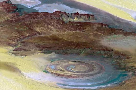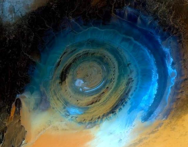 Ришат, Мавритания. Это необычное образование в пустыне ещё называют «Глаз Сахары». Его диаметр 50 км. Даже космонавты ориентируются по нему.