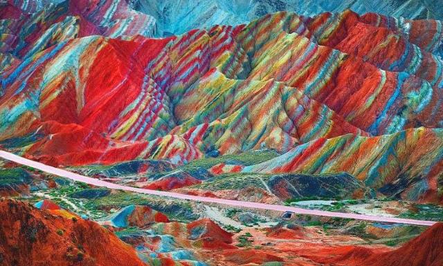 Национальный парк Чжанъе Данься, Китай. Яркий слоёный пирог из песчаника образовал горы 27 млн лет назад во время активности тектонических плит. Их площадь 510 кв. км.