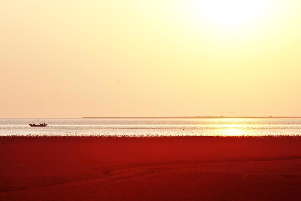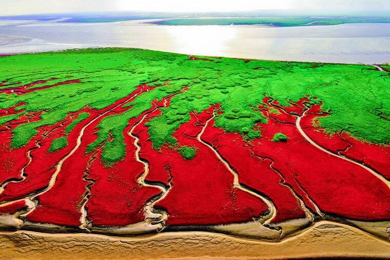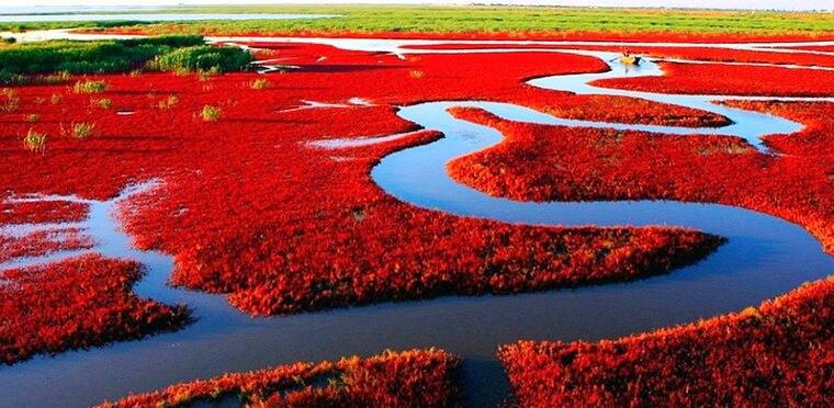 Красный пляж на реке Ляох в Китае. Этот пляж перекрашивается в красный цвет каждую осень, когда на реке Ляохэ отмирают водоросли - суаеда сальса из семейства маревых (suaeda salsa). А вообще из них делают загуститель агар-агар, который входит в состав мармелада, зефира и начинки для конфет.