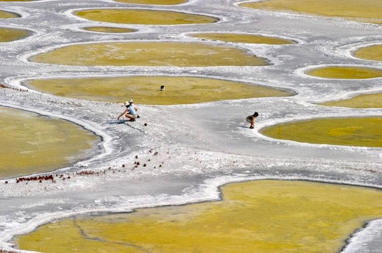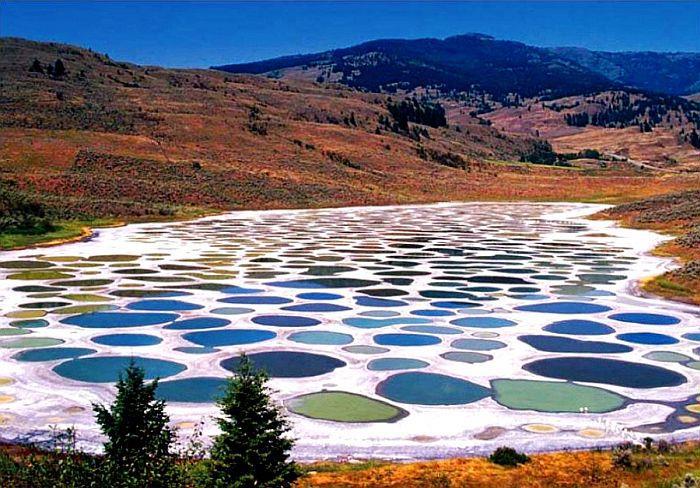 Пятнистое озеро Клилук. Воды находящегося в Канаде необычного озера насыщены полезными минерами, обладающими лечебными свойствами. Летом, когда стоит жара, вода испаряется с его поверхности и на нем образуется множество разноцветных пятен.