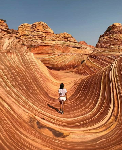 Аризонская волна - единственное в своем роде место на Земле, полностью сформированное из песчаника. Находится она на границе между американскими штатами Аризона и Юта, на плато Колорадо. 190 миллионов лет назад здесь были обычные дюны, но постепенно они превратились в скалы: ветер и дождь завершили работу над ее необычными формами. По виду кажется, что «волна» очень крепкая, однако ходить по ней следует очень осторожно: песчаник крайне хрупок.