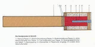 Схема картонной ручной гранаты - красным отмечена эрзац-взрывчатка, серенькое рябое - поражающие элементы, насыпанные между двумя картонными цилиндрами.