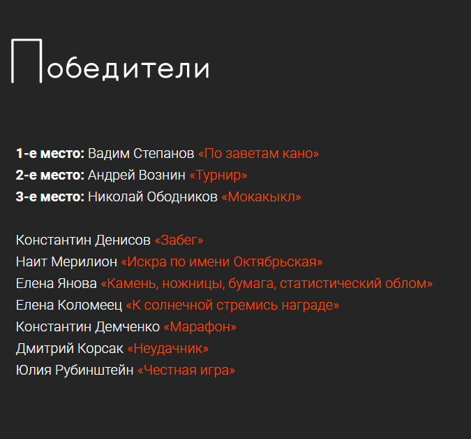 Всех финалистов, насколько я понимаю, назвали победителями, хотя дипломы и индивидуальные. Не знаю, почему решили не прописывать реальное место. Наверное, хотели потешить наше самолюбие. Победил и точка!