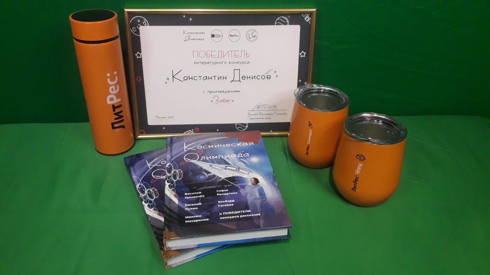 Так же, как видите, прислали два экземпляра сборника, куда вошли рассказы финалисты и рассказы членов жюри. Термос, который показывает температуру и пару термокружек к нему. Должен сказать, что такие вот призы очень греют, потому что они остаются на память. Сейчас очень часто во многих конкурсах только денежные призы. Но вот такие, на мой взгляд, обязательно должны входить  в награждение. Сборник, диплом и какой-нибудь мерч -- это здорово.