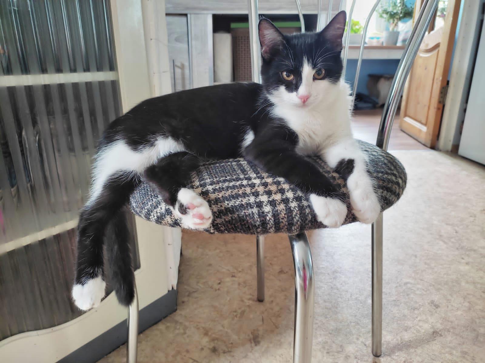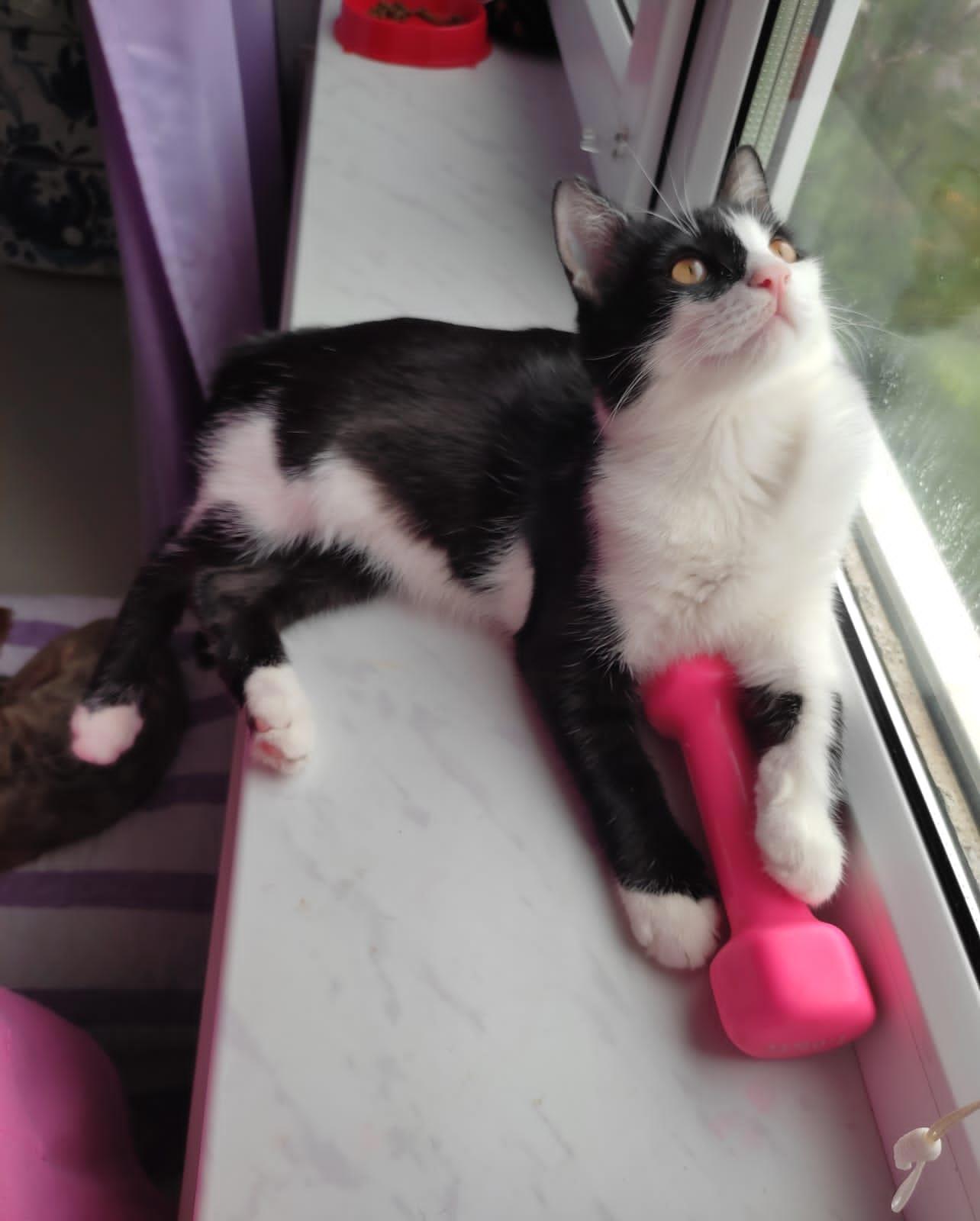 У чёрно-белого Изюма, хозяева никак не находились. Он уже основательно подрос, по дому ходил хозяином. По словам дочки - он просто душевный кот! Добрый, ласковый, но, иногда обижает старших (котов) и немного xyлuгaнuт.