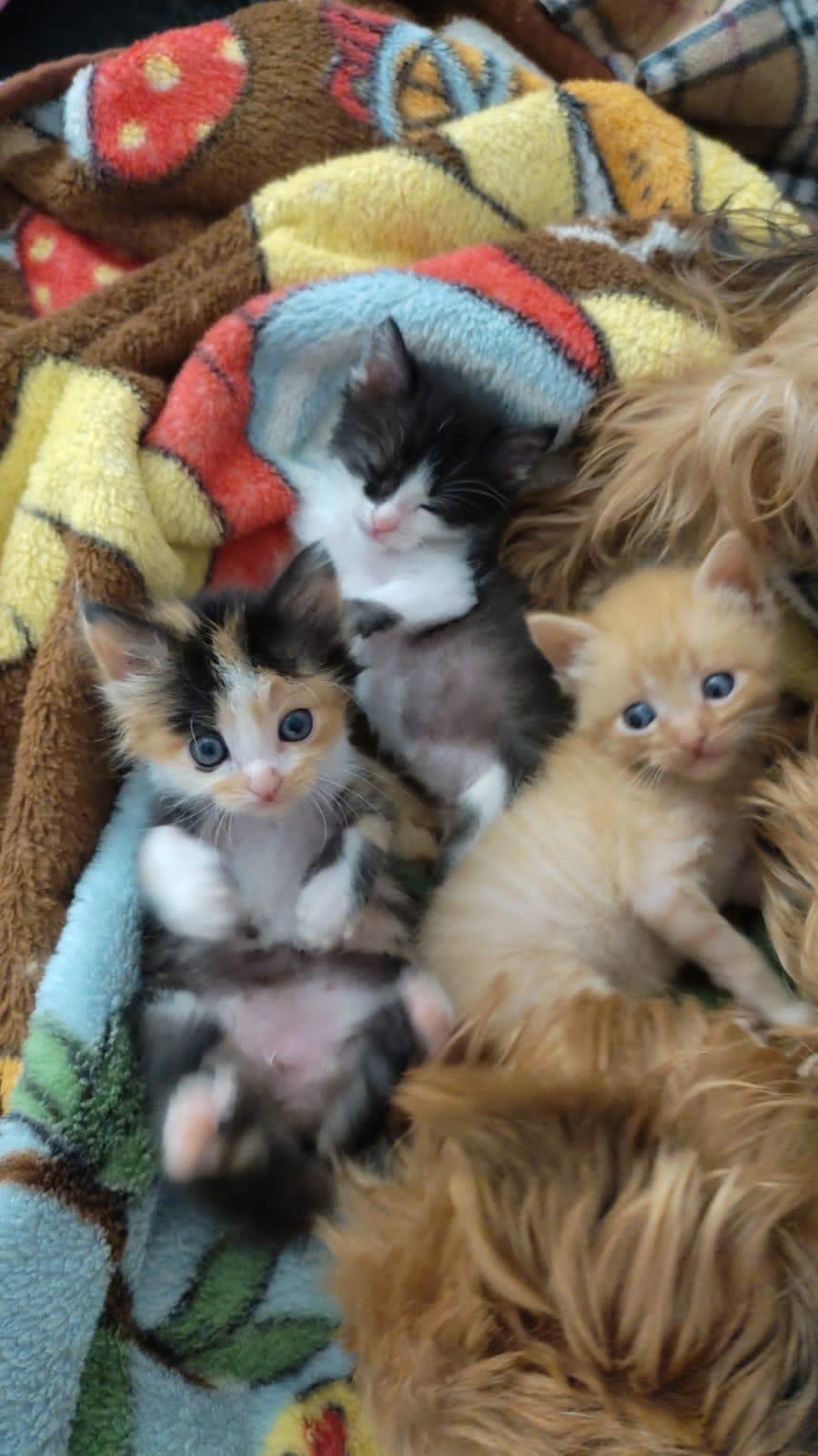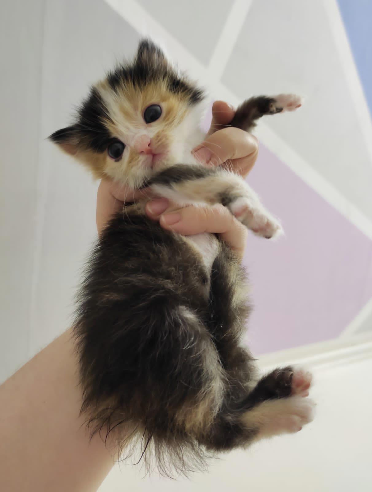 В один из первых дней июня, моя дочка пошла выкидывать мусор. Она услышала еле слабые писки из мусорного бака. В нём нашёлся кусок целлофана, в котором была смотанная тряпка. А в ней: четыре новорождённых котёнка. К сожалению, один уже не дышал...