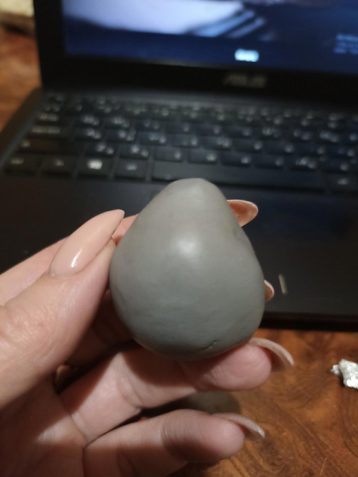 Глину раскатываем в блин, закрывает шарик. На тельце лепится голова, придаётся чуть вытянутая форма. Для ушей и лапок раскатываются вон такие, как внизу, продолговатые кусочки, всего 6 штук (4 лапы, 2 уха + хвост)
