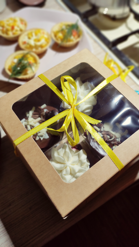 И, да, оформление на самом деле важно, и ещё как. Коробочки, например. Коробочки я заказываю, та, которая на фото, белорусского производства, двусторонняя, можно собрать на крафт, можно на белую сторону, эта собрана на крафт. Раньше коробочки покупала в магазинах для кондитеров, теперь - заказываю, ищу, где адекватные цены, сейчас они очень подорожали.