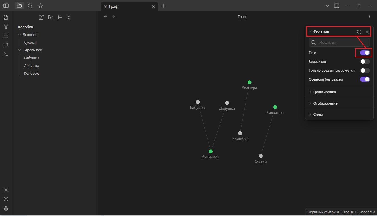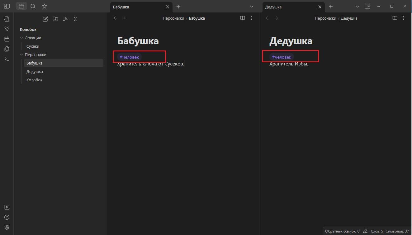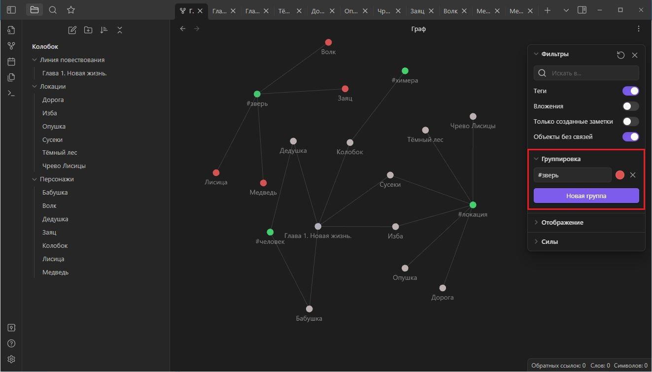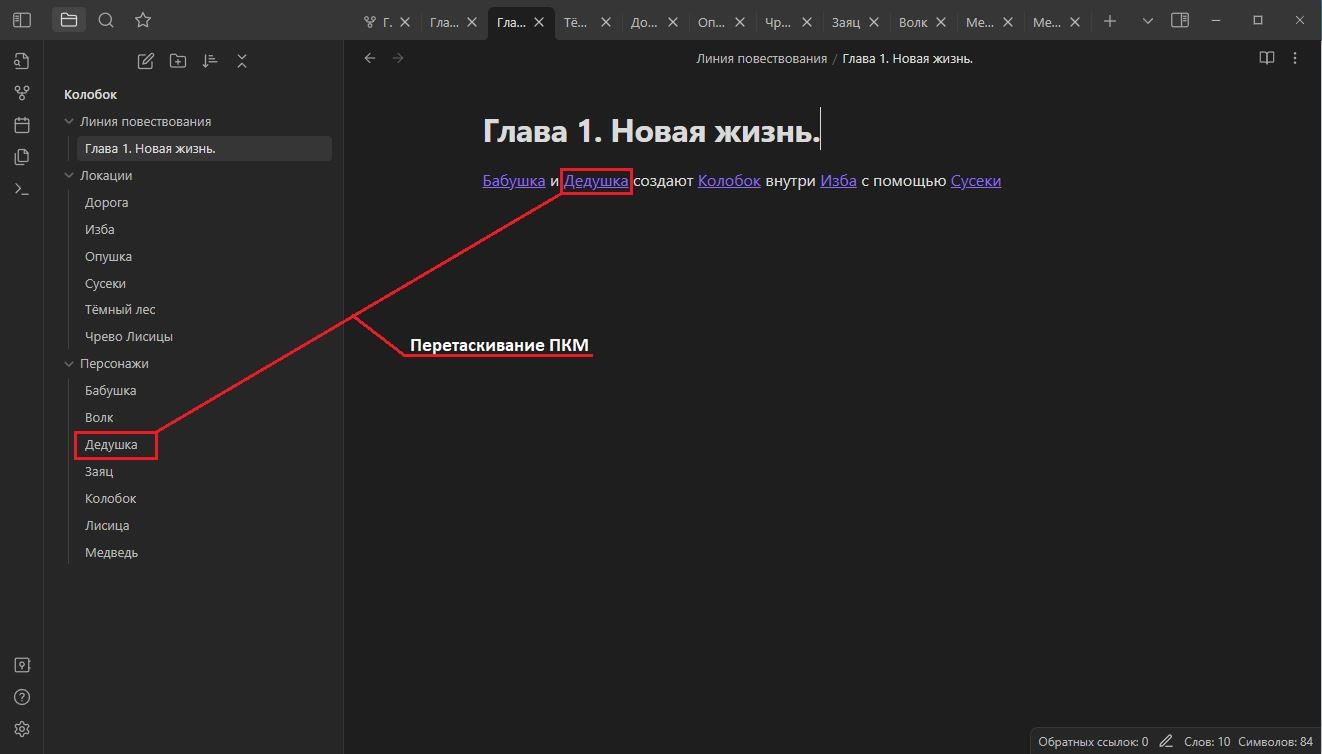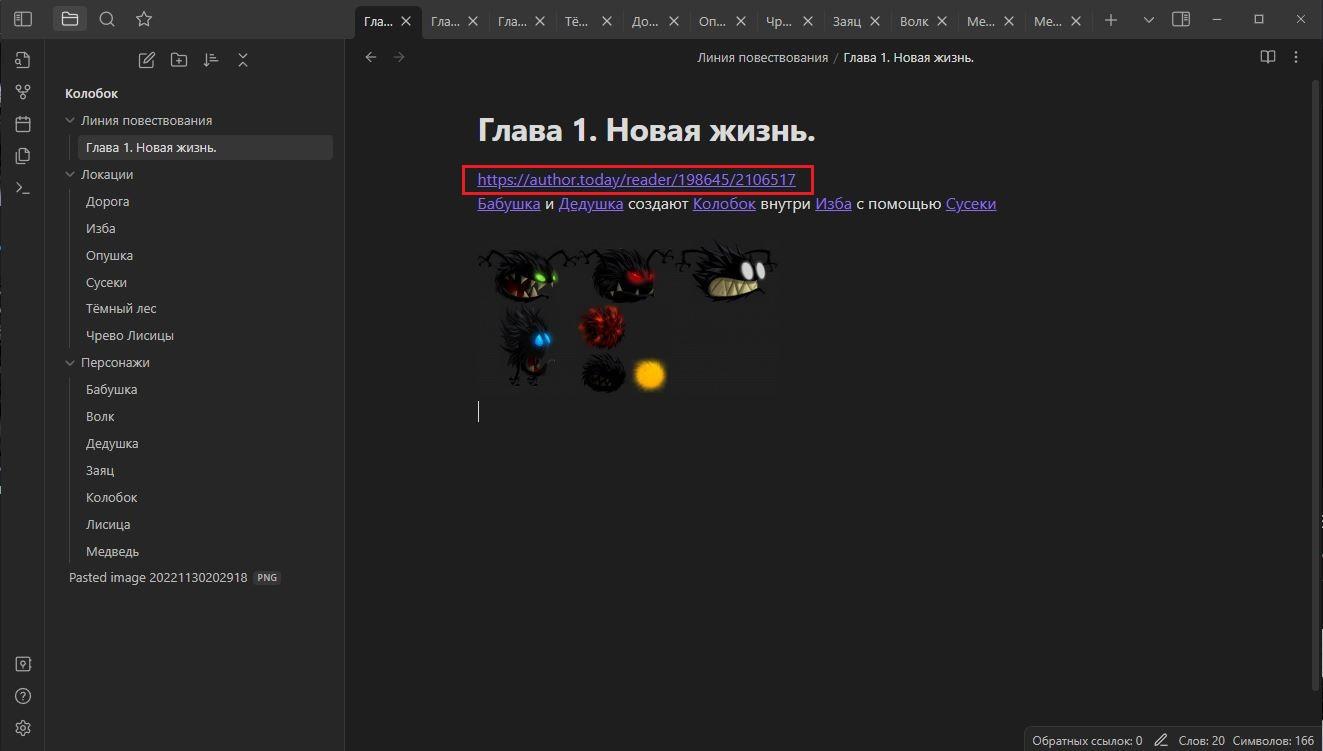 Создаём еще больше персонажей и папку Линия повествования. В ней создаём заметку Глава 1 Новая жизнь. и обычным перетаскиванием добавляем в неё всё что относится к первой главе.