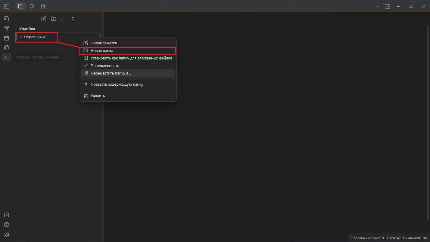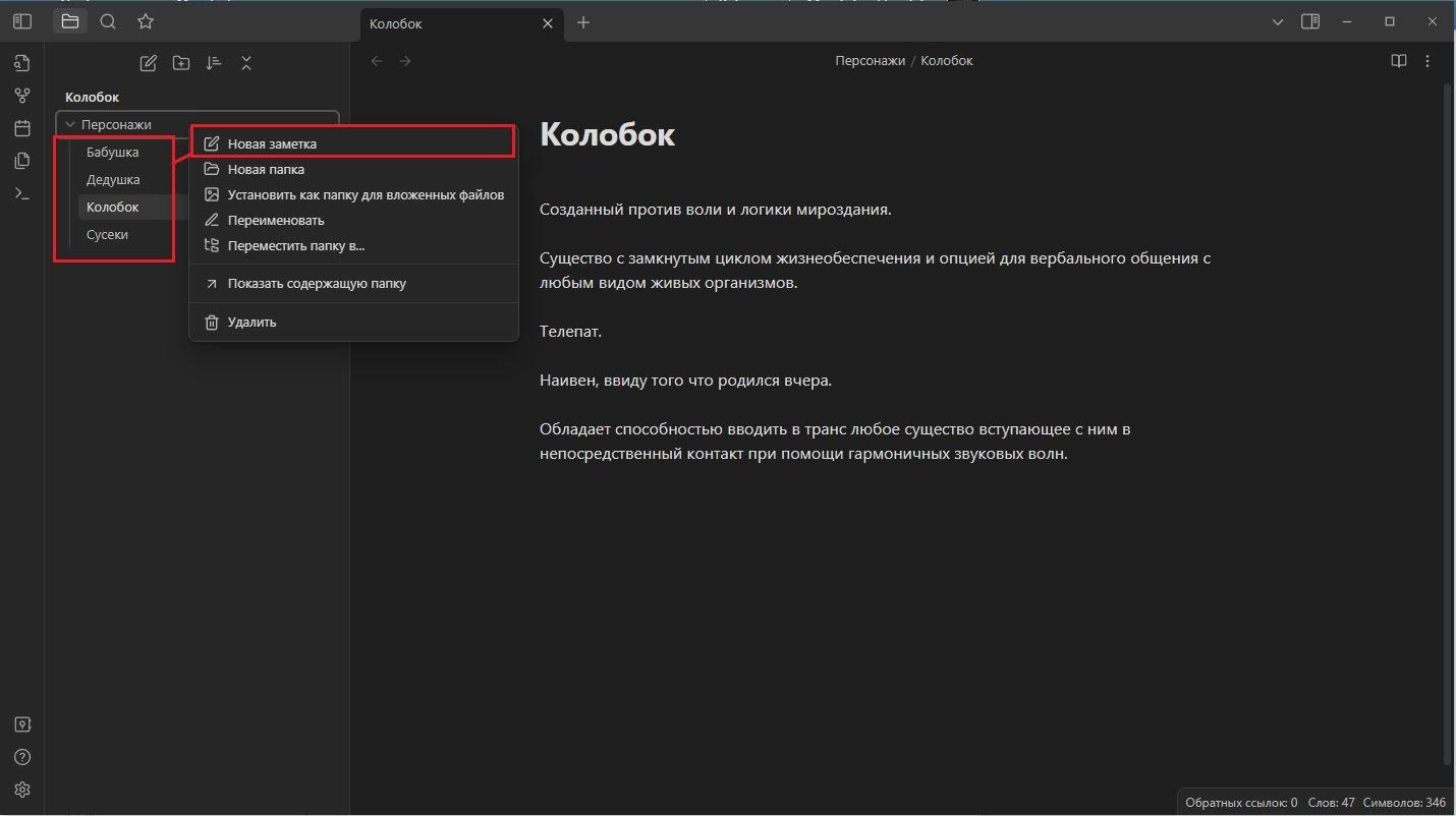 ПКМ на папку и создаём ЗАМЕТКИ. Каждая заметка соответствует одному персонажу.