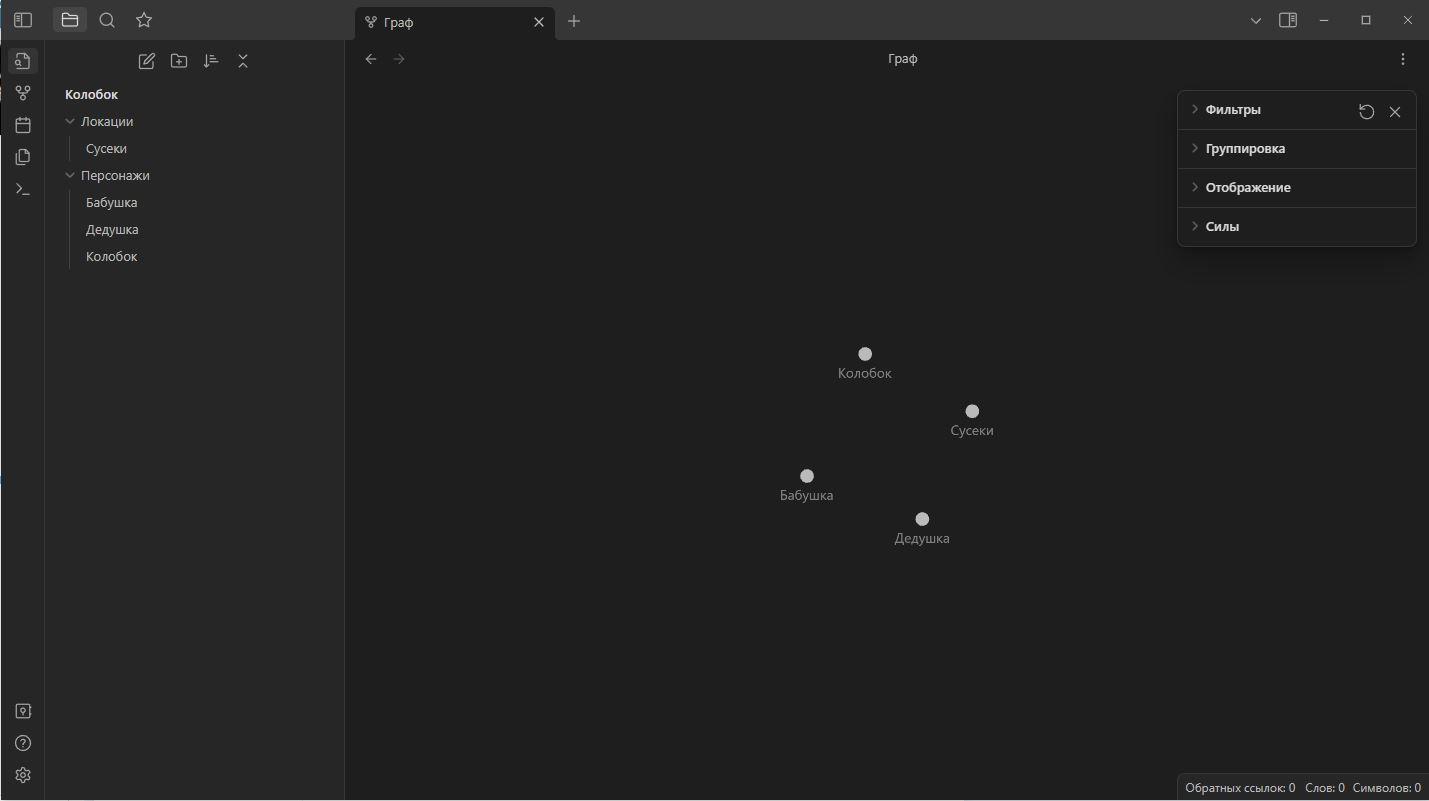 Пример ниже, это наброски моей собственной вселенной в Obsidian: