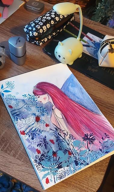 Что касается техники: она смешанная. В моём случае это значит, что рисовала я всем, что под руку подвернулось. В основе любимые акварельные карандаши (faber-castell, я ими пользуюсь много лет). Контуры прорисованы линерами. Растения сделаны с помощью трафарета и акриловой краски, частично на рисунке есть серебряный маркер и серебристая акварель. На просохшем рисунке я делала прорисовку цветными, не акварельными карандашами. В основном добавляла детали на фигуре героини.