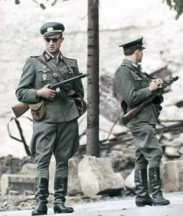 Тыловые службы ННА были вооружены точно так же, как и боевые, так же занимались охраной и обороной -  например себя самих. Так что уверен, что немцы были и да, стреляли. Это  99% было - другое дело не сотнями, вполне достаточно для рассказов  пары-тройки случаев применения часовыми оружия. С поощрением убившего громил, нападавших на часового. И потом ссыкливые чехи  их как огня боялись.
