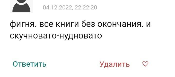 Но вот претензия про то, что все книги без окончания... Ну, так это цикл. Книгу написали - выложили. Судя по статистике, данный комментатор посмотрер первую и последнюю главу, чтобы убедиться, что продолжение следует (заголовка "Мускан. Сердцу не прикажешь. История Кинии - 1" и второй части в произведениях было недостаточно, они на подобный вывод не навели).