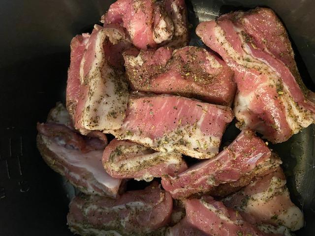 Это свинина, реберная часть, но в основном мясо, а не голые гости (как "для барбекю"). Посолить, поперчить, всеми любимыми специями обмазать, например, еще праванскими травами и чем угодно, чуток помариновать и кинуть в мультиварку. Режим выпечки