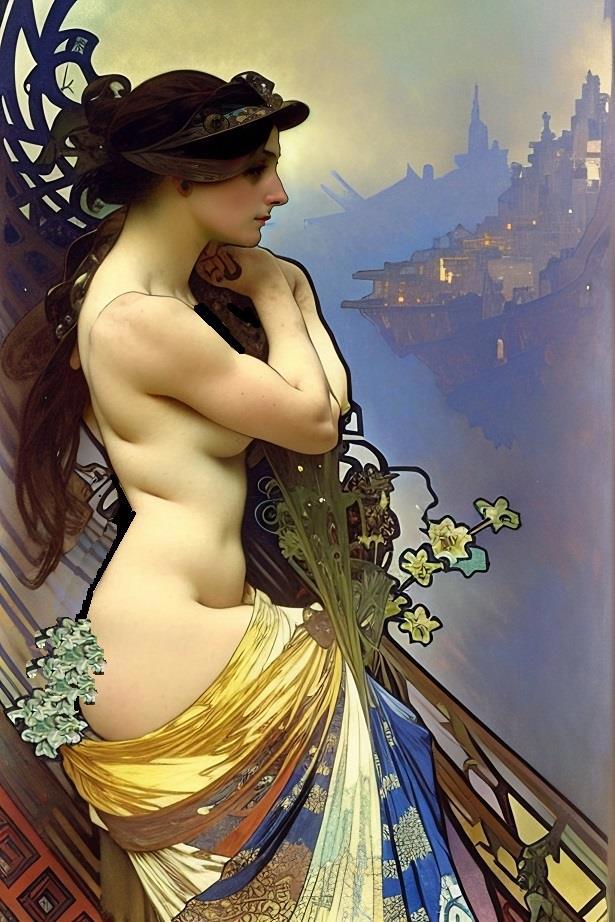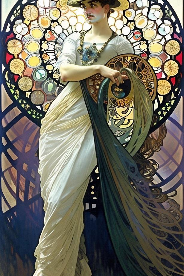 Ладно, сеть при этом умная: различает Гейнсборо и Рейнольдса, а их самих отличает от Джереми Манна и Альфонса Мухи. Да-да, сама проверяла, нигде она не запуталась.  Но вот на заказ,  - что может быть обычней, а? - "симпатичного мужчины в духе Манна и Мухи, арт нуово" получаю: